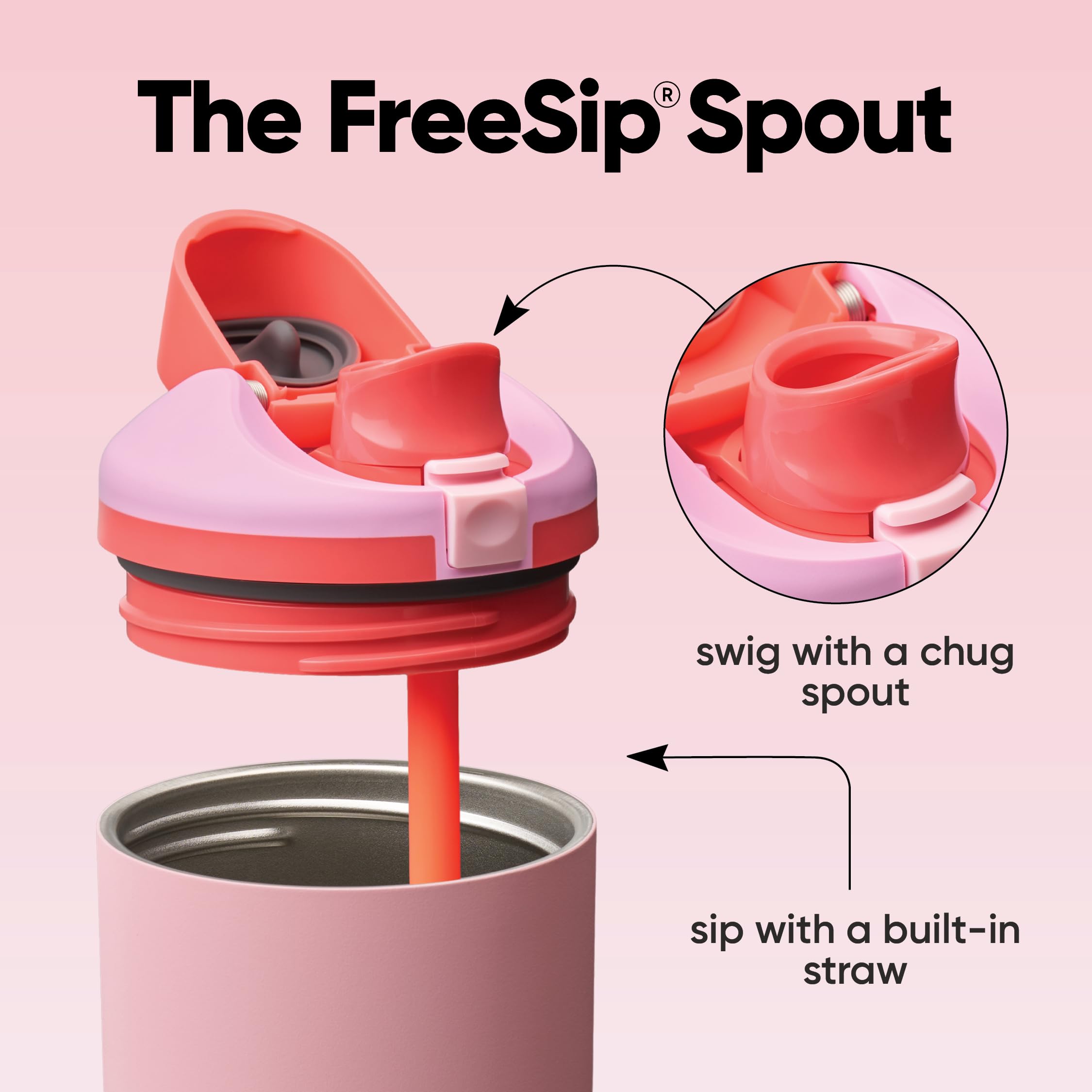 - Versatile FreeSip spout lets you choose how you drink: Patented 2-in-1 FreeSip spout gives you two options when drinking; sip upright through built-in straw or swig by tilting back the spout opening